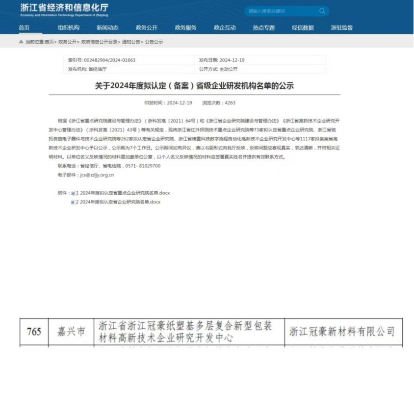 近日,浙江省經(jīng)濟(jì)和信息化廳公示了 2024 年度省級(jí)企業(yè)研發(fā)機(jī)構(gòu)認(rèn)定結(jié)果,浙江冠豪順利通過浙江省高新技術(shù)企業(yè)研究開發(fā)中心認(rèn)定,被正式授予“浙江省浙江冠豪紙塑基多層復(fù)合新型包裝材料高新技術(shù)企業(yè)研究開發(fā)中心”稱號(hào),這一重要成果標(biāo)志著浙江冠豪在科技創(chuàng)新和研發(fā)能力方面邁出了堅(jiān)實(shí)的一步。