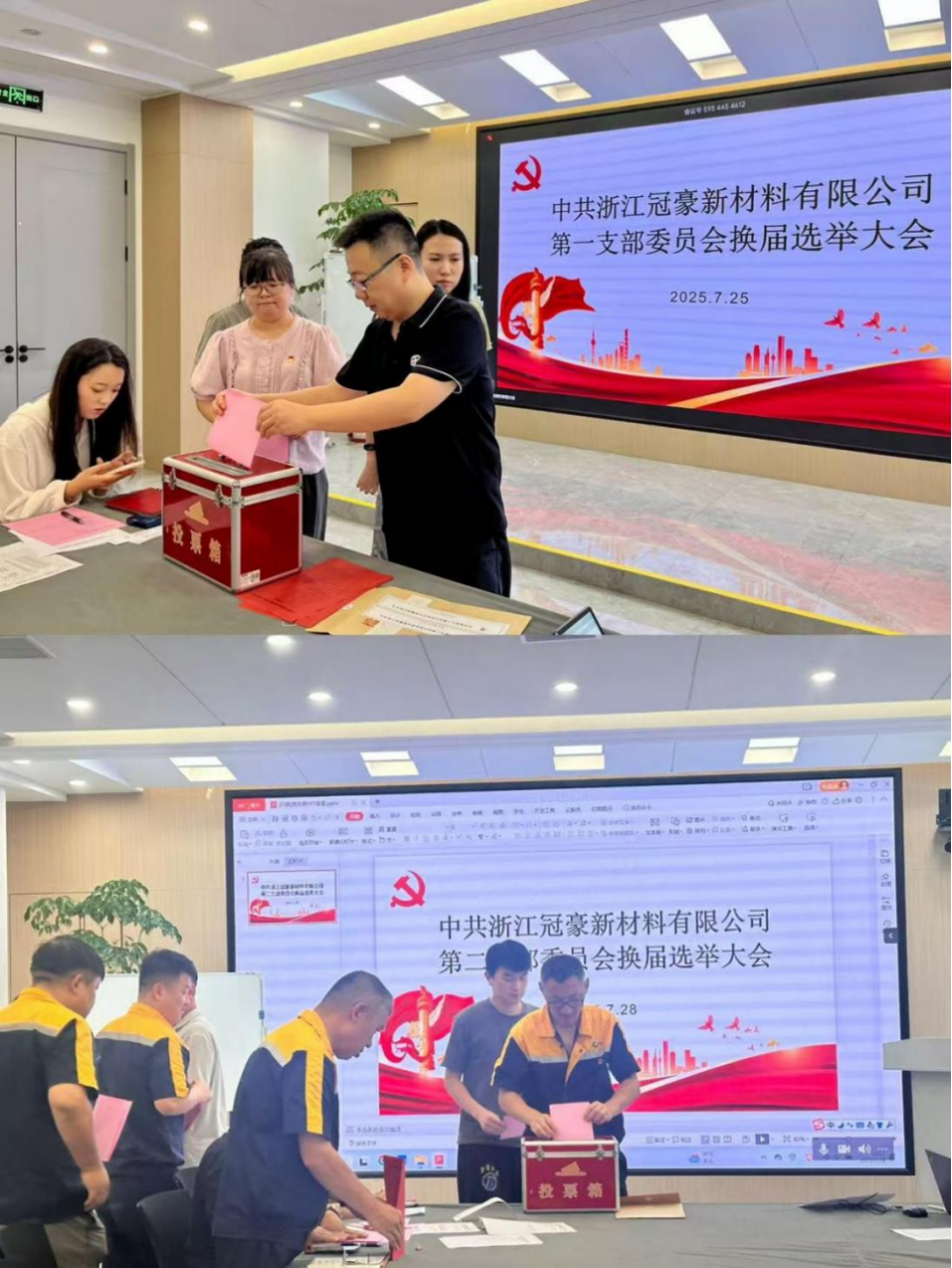 7月25日與7月28日,浙江冠豪黨總支及所屬黨支部相繼召開換屆選舉大會,圓滿完成了黨總支及兩個黨支部的換屆選舉工作,為企業(yè)高質(zhì)量發(fā)展提供了堅強的政治和組織保證。